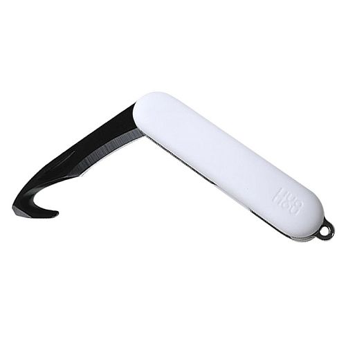 Одной из главных особенностей представленного ножа является серповидное лезвие, о которое практически невозможно случайно пораниться. С помощью такого лезвия максимально удобно вскрывать разные упаковки и коробки, а также разрезать веревки.