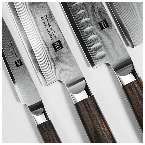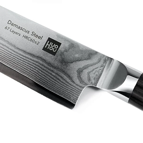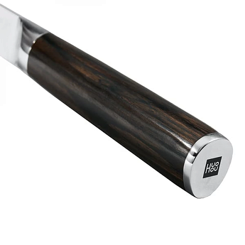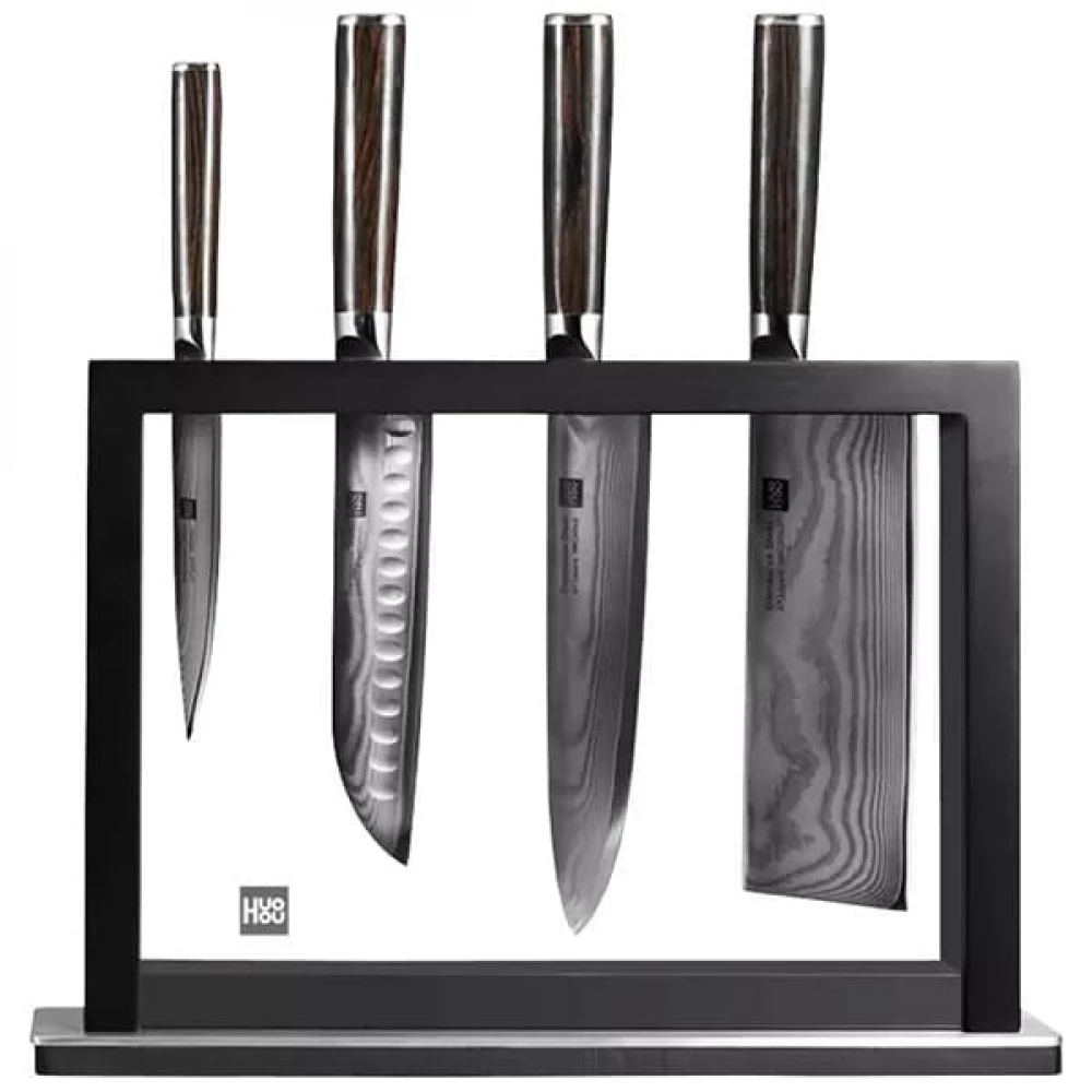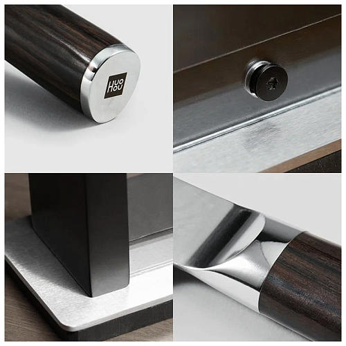 В противоположность прочной и несгибаемой стали производитель Huo Hou поставил нежное, но крепкое чёрное дерево, из которого изготовлена рукоятка. К ножам прилагается подставка, которая позволяет удобно хранить их и выступает в качестве витрины для наслаждения искусным узором ножей.