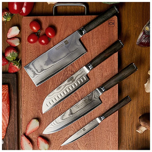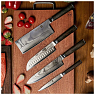 Отличный арсенал кухонных инструментов из качественной и острой дамасской стали. В нём находятся ножи для универсальных задач домашнего повара. Естественный дамасский узор неповторим, благодаря чему создаётся уникальный дизайн каждого столового прибора. Удобная подставка позволяет красиво и компактно хранить ножи.
