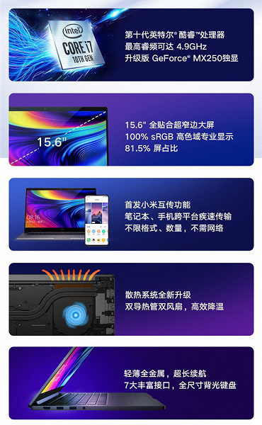 Mi Notebook Pro 15.6 Enhanced Edition это первый ноутбук от фирмы Xiaomi, который может поддерживать функцию моментального обмена информацией со смартфонами. Помимо этого, эта технология присутствует в еще одной новинке - Xiaomi RedmiBook 14 Ryzen Edition.